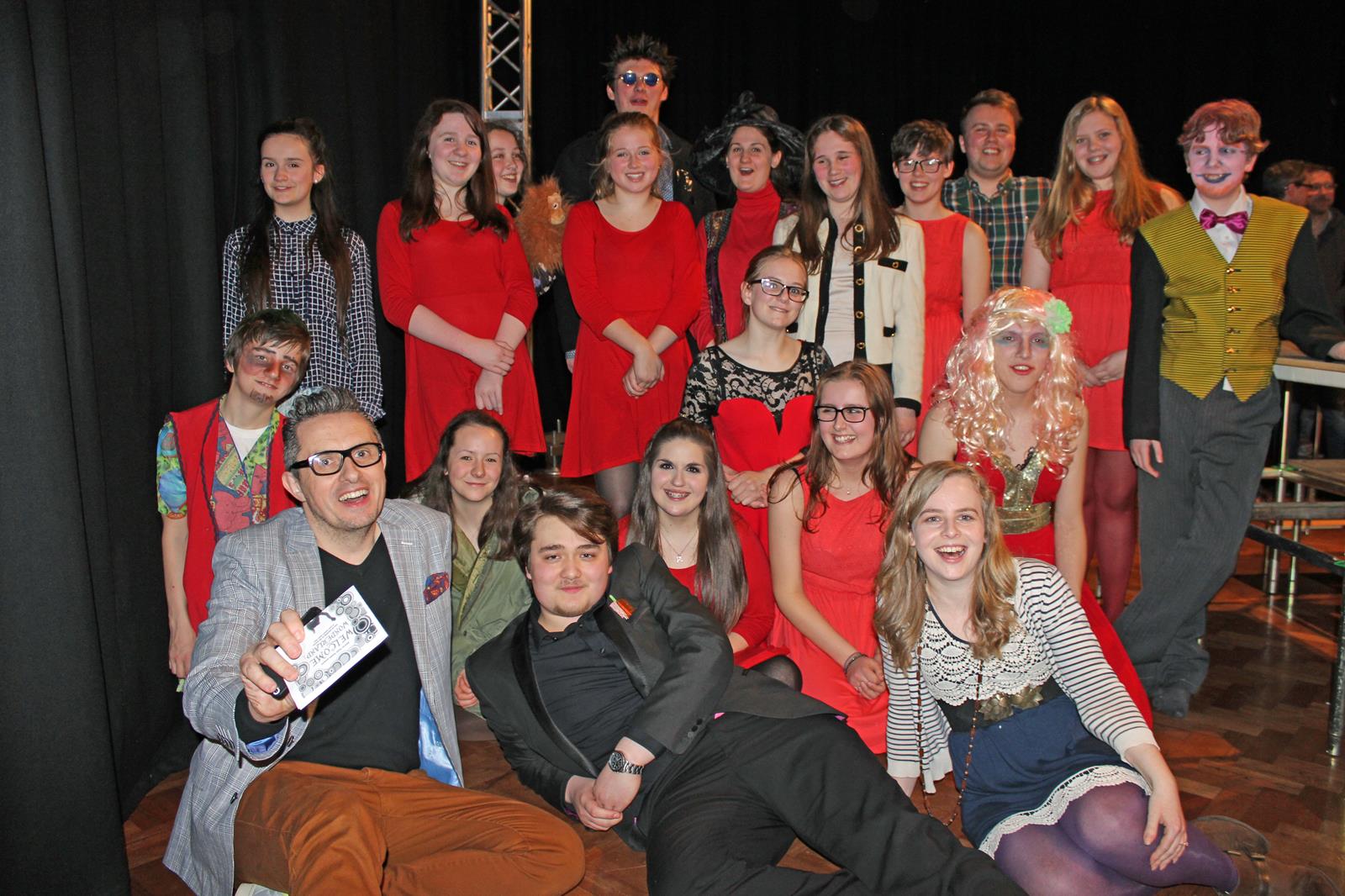 The full cast with (front L-R) writer Jim Johnson, youth theatre leader Kyle Hill and artistic director Steph Brocken