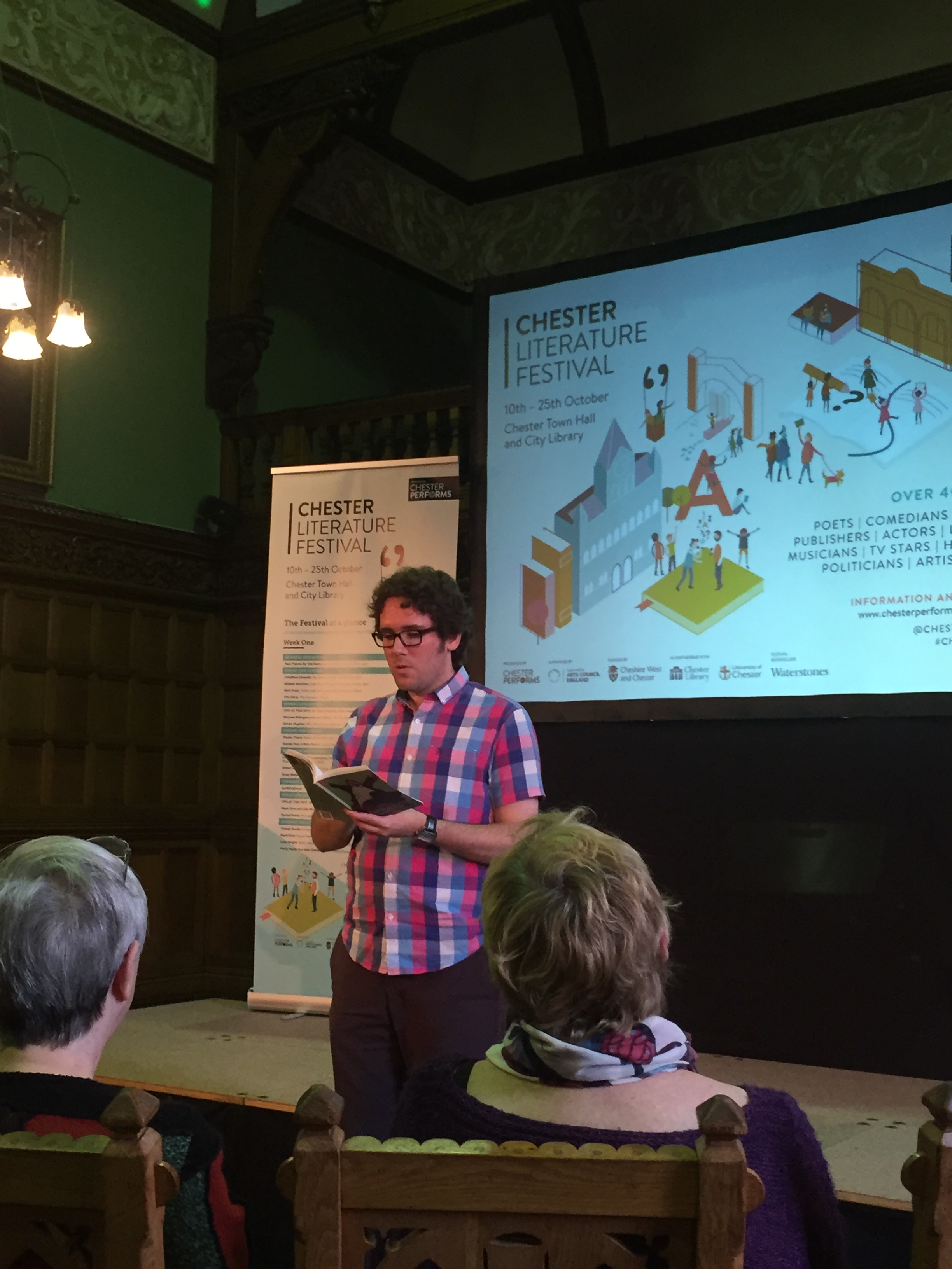 Our Chester Lit Fest odyssey began with a talk from award-winning poet and Welsh wordsmith Jonathan Edwards. Jonathan, who by day is a high school English teacher, breathed life into poems about My Family and Other Superheroes, with his lilting, sing songy South Walian accent momentarily transporting us from historic Chester Town Hall to the valleys of South Wales. Jonathan combined a poet’s acute powers of observation with a good dose of humour and at times incredibly moving stories from his past.