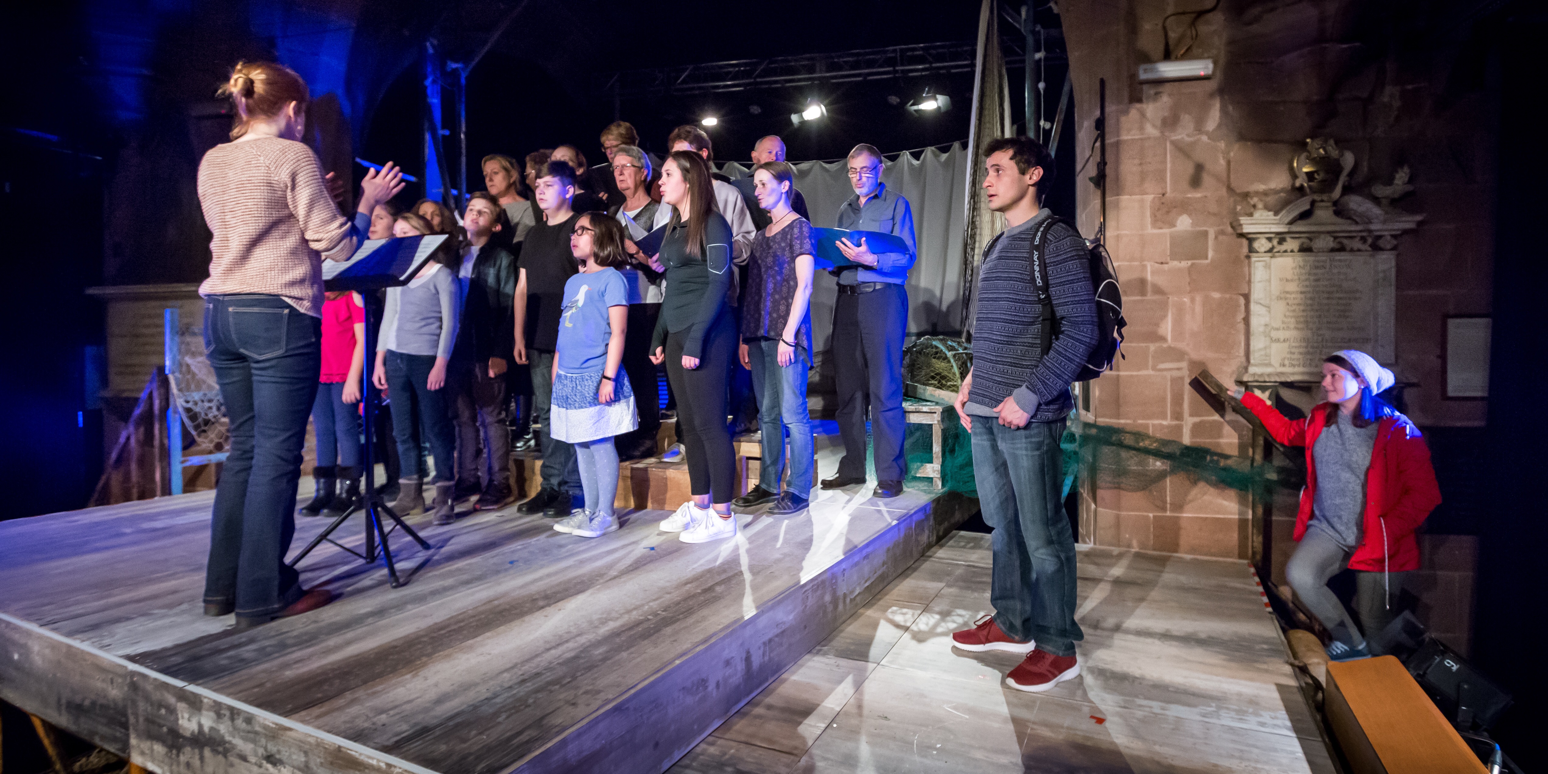 Contrast this with a sudden transformation as the chorus cast off their coats and leave the dark intense atmosphere to suddenly become a bubbly choir gathering for rehearsals in a cosy community hall.