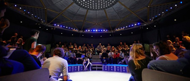 In the bare stage of the Roundabout’s inner circle, it is up to us, the audience, to create the scenery and props, with Katie, Sally, and Hasan working their magic to coincide with our sets.