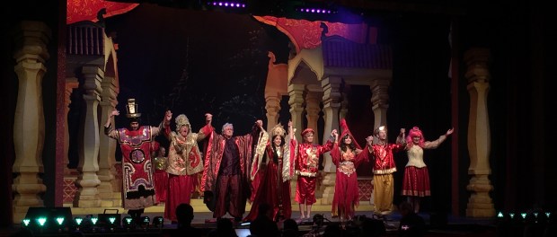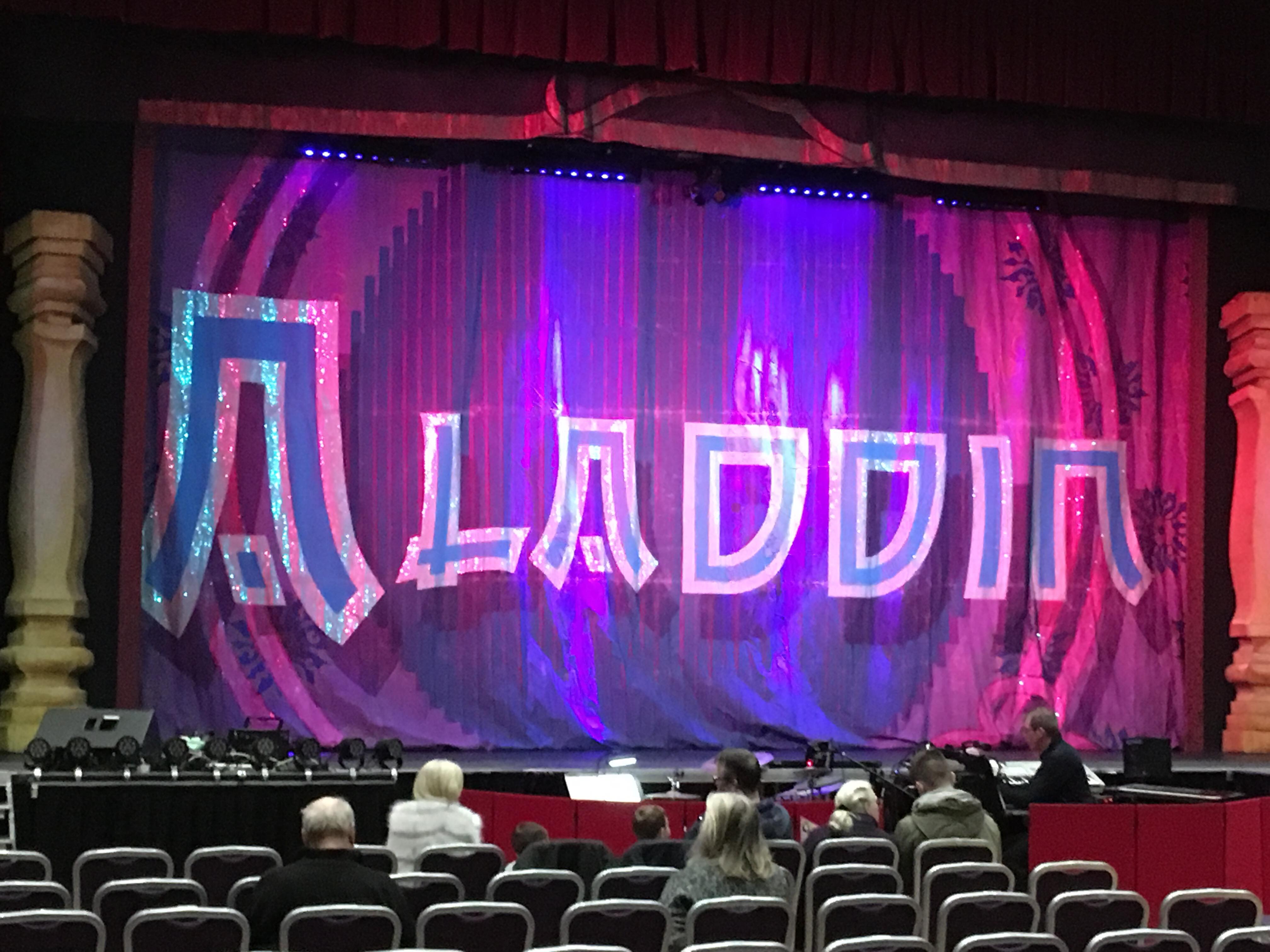 As we took our seats in the theatre, on stage we were greeted by a bright, glimmering curtain with Aladdin written on it, ready to go up for the show to begin. The theatre was filled with excited families, and also a number of adults scattered around to watch the show too – proving panto is for everyone, not just the kids.