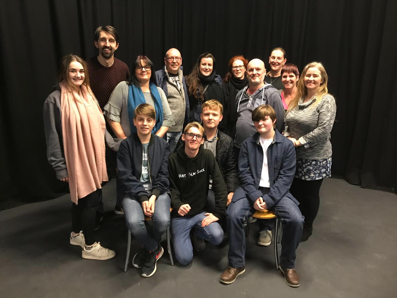 Main photo: Cast members during a break in rehearsals for of The Witches (L-R) Eleanor Moulson, Robert Lyon, Lynda Cross, Ben Rackham, Chris Griffiths, Jake Cross, Fiona MacSween, Finn Hibbert, Kat Tanczos, Steve Cross, Zach Waddington, Caireen Candlin, Dawn Adams and Paula Condliffe-Hughes.