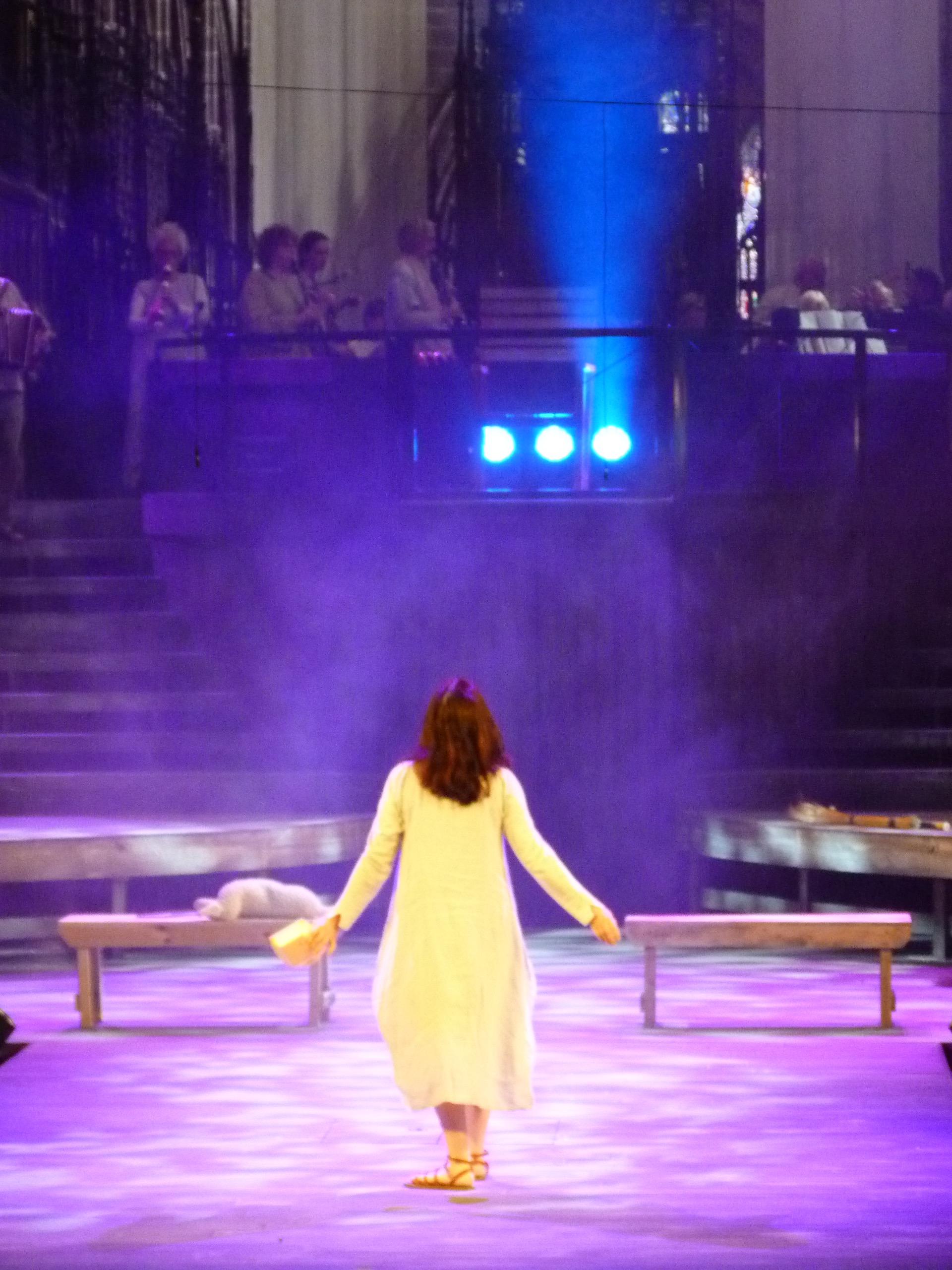 Angela on stage during the Chester Mystery Plays (with thanks to Angela’s fellow Mystery Player Margaret for this photo)