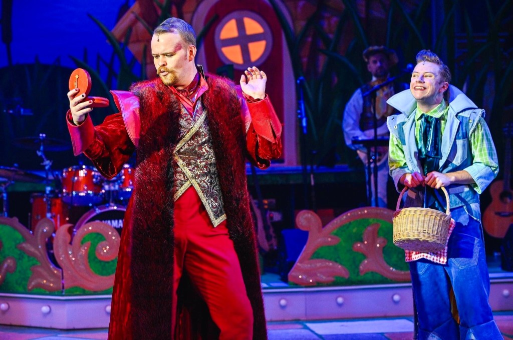 Ben Locke as Barry Island and Luke Thornton as Bob in Beauty and the Beast – The Rock ‘n ‘Roll Panto at Theatr Clwyd