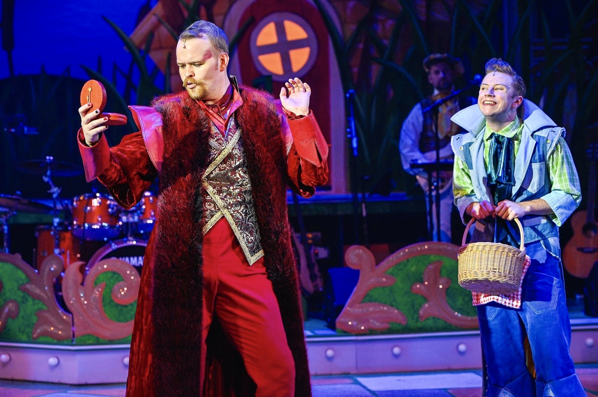 Ben Locke as Barry Island and Luke Thornton as Bob in Beauty and the Beast – The Rock ‘n ‘Roll Panto at Theatr Clwyd