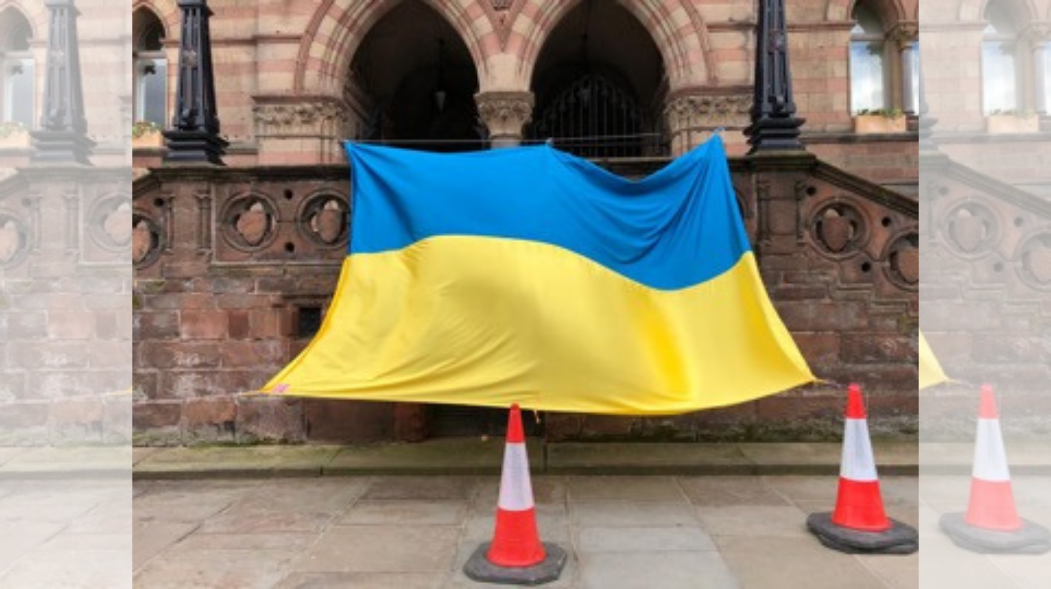Main image: A Ukrainian flag is displayed in front of Chester Town Hall in support of the people of Ukraine. Photo: Vivian Onyekwere.